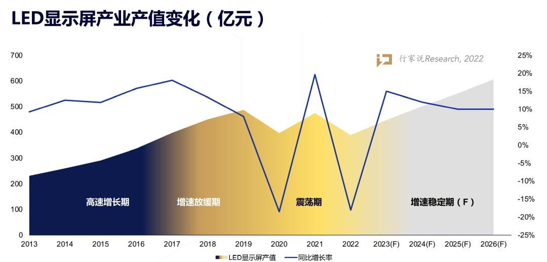 这三年间也经历了疫情反复的影响,仅从LED显示屏的产业产值变化来看,近三年变动明显。