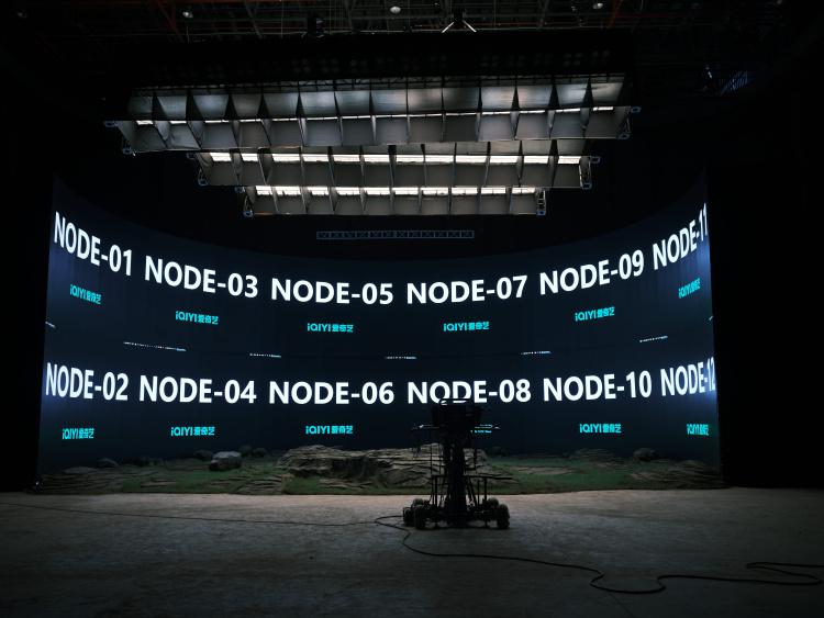 爱奇艺的虚拟制作基地位于横店一座新建的影视产业园内。从一排颇为复古的西式建筑进入,便是爱奇艺刚刚在此搭建不久、占地约 2400 平米(约为三分之一个标准足球场大小)的虚拟制作棚。一块巨大的弧形 LED 屏幕立在摄影棚中央,今年 7 月,这块大屏刚刚从河北大厂搬迁过来。