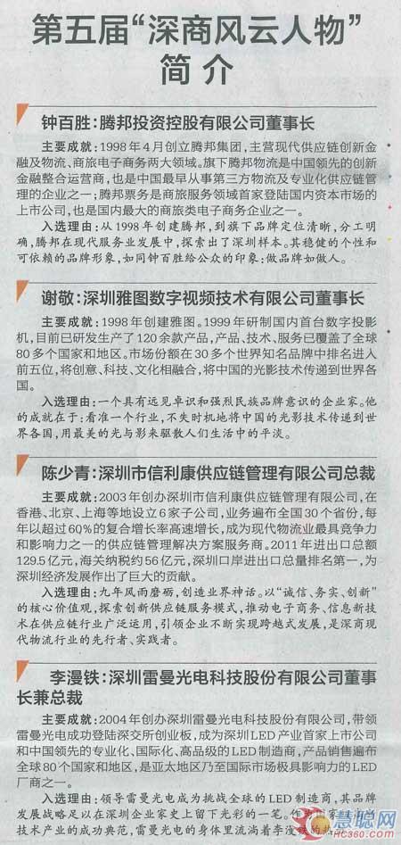 慧聪LED屏网12月25日报道 12月19日下午,深圳商界的年度盛事——2012“深商风云人物”评选结果正式揭晓。雷曼光电董事长李漫铁等10位企业家在众多候选人中脱颖而出,成功当选第五届“深商风云人物”。