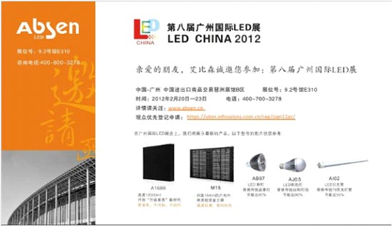 慧聪LED屏网2月16日报道2012年2月20-23日,深圳市艾比森光电股份有限公司将隆重参加第八届广州国际LED展,主要展出A1688“万级高亮”全彩屏、M15户内外两用租赁显示屏、AB07LED射灯、AJ05LED球泡灯、AI02LED日光灯等