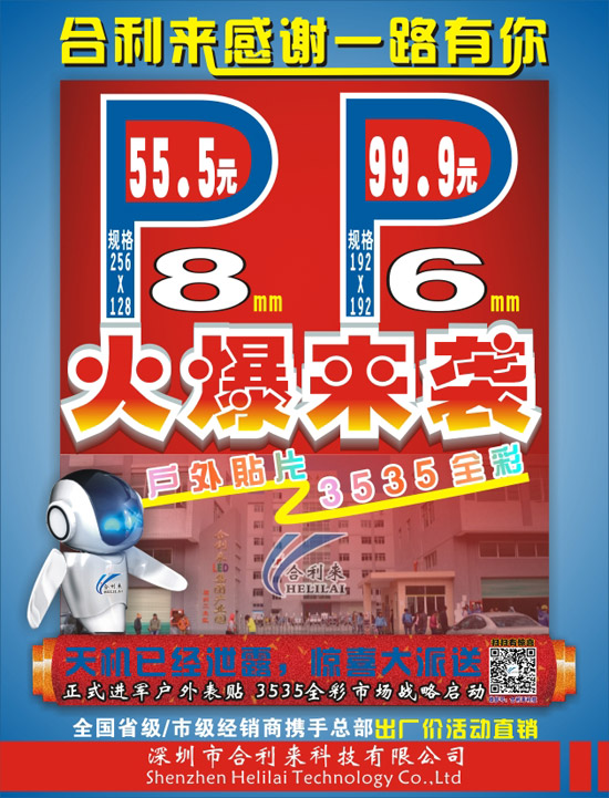慧聪LED屏网报道 合利来通过近期两个月的试产和产能规划布局完善后,现正式进军户外贴片P5-P6-P8全彩市场,室内/户外贴片全彩产品持续性价比战略已启动。新扩室内外贴片生产车间4200平方场地装修中,春节前完成月产