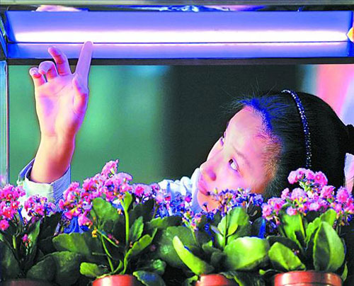 5月16日,邯郸县奥玻集团的工作人员正在展示该集团最新研制出的LED转光生态玻璃。
