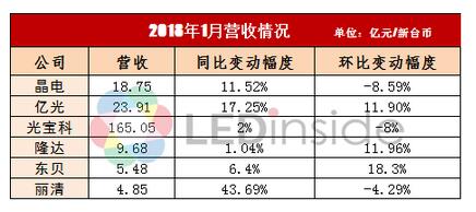 慧聪LED屏网报道 晶电、亿光、东贝、光宝科、隆达等台系LED大厂均已公布1月份业绩单,与2017年1月相比皆有所增长,增长幅度分别为11.52%、17.25%、6.4%、2%、1.04%。LED车灯厂商丽清科技也开出红盘,走出传统第一季的