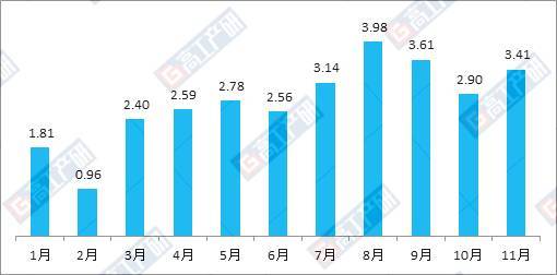 慧聪LED屏网报道 GGII发布的《2016-2017年中国LED照明出口月度监测报告》数据统计显示,2017年11月中国LED球泡灯出口总额约3.41亿美元,出口数量约2.96亿只。