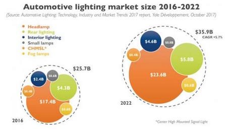 慧聪LED屏网报道 据外媒报道,据市场研究公司Yole Développement透露,2016年车灯市场的总市值为257亿美元,预计到2022年将增至359亿美元,2016-2022的复合年增长率(CAGR)为5.7%。