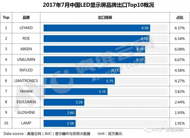 慧聪LED屏网报道 奥维云网(AVC)《中国LED显示屏出口月度数据报告》显示,2017年7月我国LED显示屏产品实现1.35亿美元的出口规模。其中,top10厂商出口金额为5900万美元,占行业月度出口规模的43.8%,出口市场竞争较为