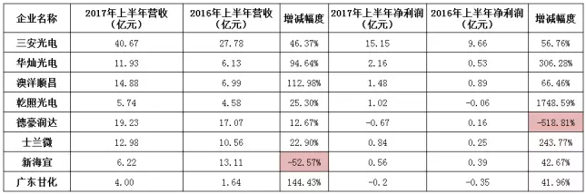 慧聪LED屏网报道 截至8月30日,随着德豪润达2017年上半年业绩报告披露完毕,包括三安光电、华灿光电、澳洋顺昌、士兰微以及乾照光电等在内A股上市的LED芯片企业中期财报披露工作告一段落。
