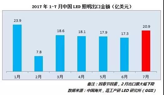 慧聪LED屏网报道 GGII发布的《2016-2017年中国LED照明出口月度监测报告》数据显示,2017年7月中国LED照明出口总额达20.9亿美元,较上月增长21%。总体来看,自前面3-6月份出口市场行情下倾以来算是一大增长的整体态势