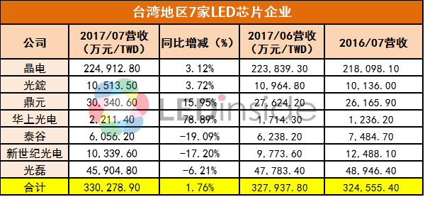 慧聪LED屏网报道 近日,台湾地区LED厂商7月营收数据陆续出炉。据LEDinside统计,台湾地区7家LED芯片企业(晶电、光宏、光磊、华上、泰谷、新世纪光电、鼎元)合计营收330,278.90万元(新台币,下同),同比上升1.76