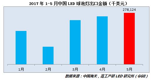 慧聪LED屏网报道 一、整体分析 GGII发布的《2016-2017年中国LED照明出口月度监测报告》数据显示,2017年5月中国LED球泡灯出口总额达2.78亿美元,较上月增长7%,出口数量约2.68亿只,较上月增长14%。