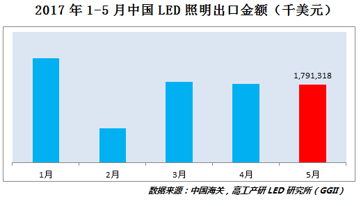 慧聪LED屏网报道 整体分析 GGII发布的《2016-2017年中国LED照明出口月度监测报告》数据显示,2017年5月中国LED照明出口总额达17.9亿美元,较上月下降1.2%,出口数量约12.8亿只。