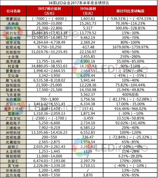 看群雄角逐!LED行业34家公司披露2017年中报预告!