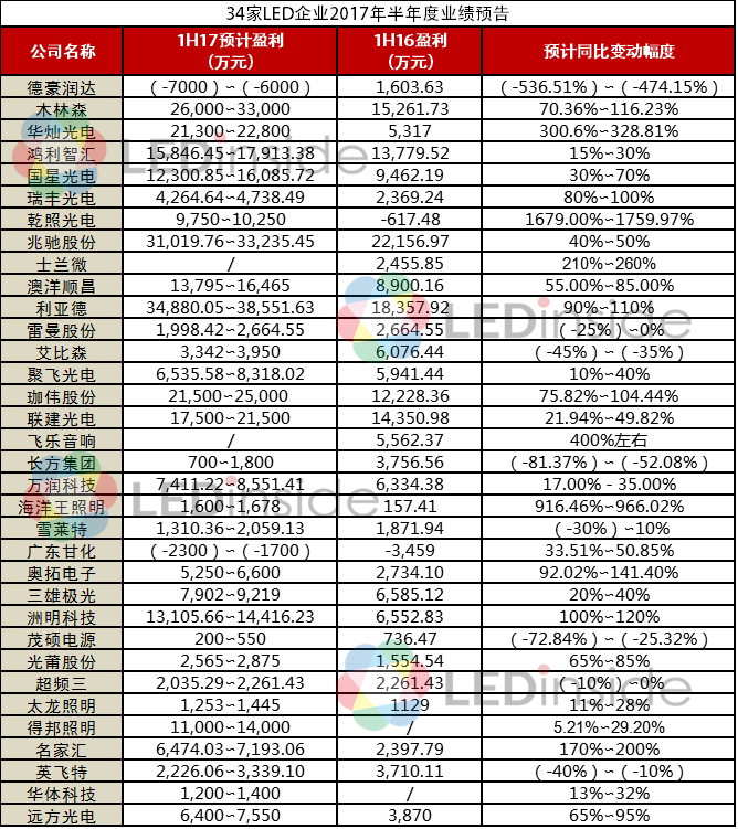 震惊!LED行业共有34家公司披露2017年中报预告!