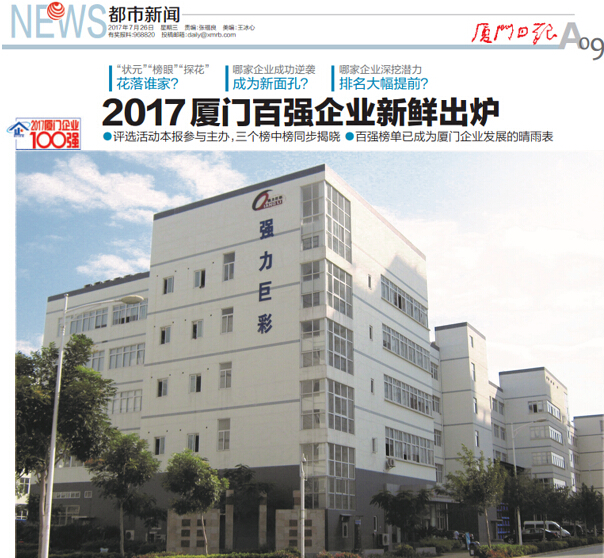慧聪LED屏网报道 7月26日,厦门企业和企业家联合会、厦门日报社、厦门广电集团联合评选的“2017厦门企业100强”排行榜强势出炉啦!厦门强力巨彩光电科技有限公司荣膺“2017厦门百强企业”及“2017厦门新兴产业专精特新