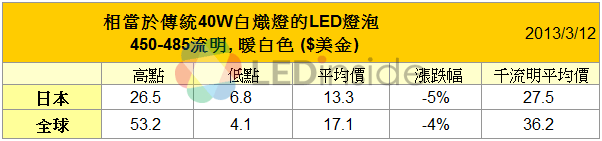 根据全球市场研究机构Trend Force旗下研究部门LED inside最新LED灯泡零售价调查显示,3月份全球各区域市场LED灯泡商品新增品项不多,原有商品价格基本呈现稳定下降趋势。全球取代40W的LED灯泡零售均价下滑3.9%,来到
