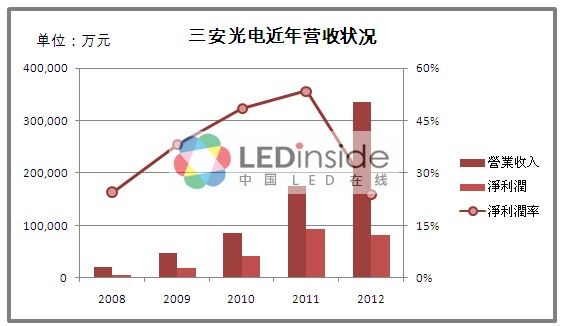 慧聪LED屏网4月9日报道三安光电发布2012年年报,显示2012年公司营收再取得跨越,年营收达到33亿。在三安的飞速发展背后,对行业有着什么样的影响?三安一枝独秀的的背后却是竞争对手的一片哀嚎,这样的零和游戏,还要