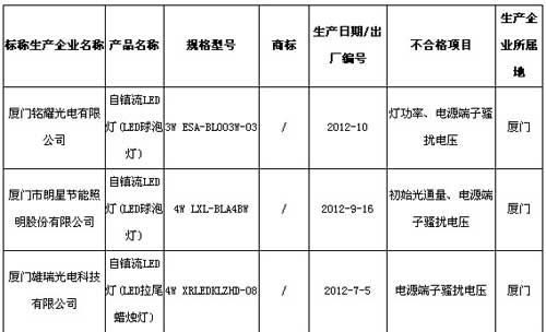 福建省质监局日前发布2012年第四季度工业产品质量监督抽查情况,将抽查中发现的主要质量指标不合格的47批次产品44家企业名单向社会公布,三家企业生产的三批次自镇流LED灯上榜。