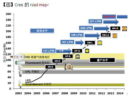 光效竞赛一直是各个厂商不能输的战争,CREE在照明市场的所向披靡不仅是其营销战略的成功,更加是技术上不断的刷新光效记录的能力(如图)为其客户持续带来的技术竞争力。2012年这种厂商间的你追我赶并没有轻松,反而