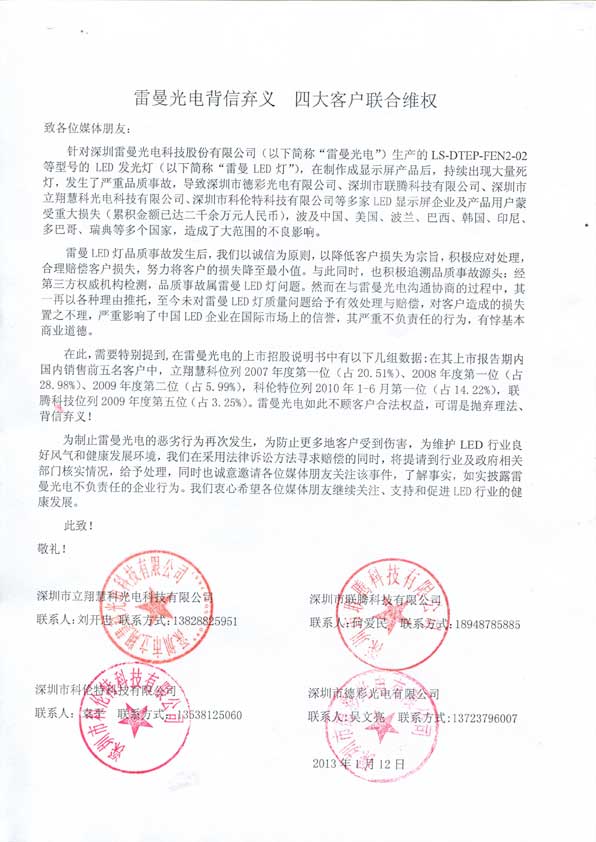 四大客户针对雷曼产品质量问题联合维权声明 延伸阅读:联腾科技关于雷曼对产品品质不负责任行为的情况说明