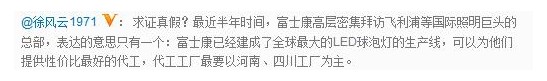 11月7日晚,雷士照明控股有限公司前副总裁徐风云发表微博,关于富士康是否将为飞利浦等照明巨头代工求证网友,该微博引起热烈讨论。