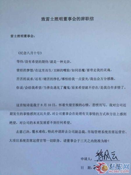 雷士副总裁徐风云写诗辞职 称对董事会绝望