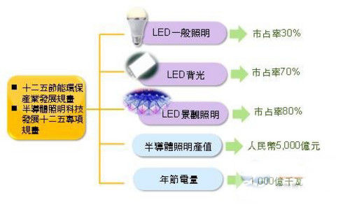 节能环保是大陆十二五规画中的重要议题,故大陆科技部及国务院分别公布《半导体照明科技发展十二五专项规划》、《十二五节能环保产业发展规划》,提出2015年以前半导体照明产业期望达到的目标,内容包括LED一般照明市
