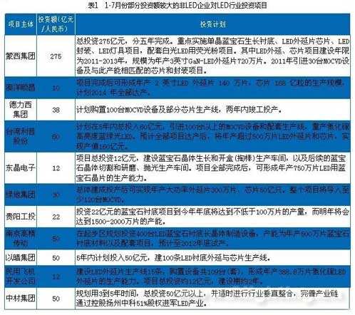 CSA数据中心根据公开资料统计,仅2011年1月至7月,我国LED行业计划新增投资总额1256.18亿元,其中超过40%的资金是在多个产业环节投资,甚至是进行全产业链投资;上游的衬底和外延芯片仍是投资的重点和热点,可以明确统