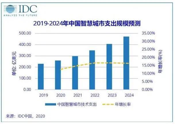近日,IDC发布了《全球智慧城市支出指南》,指南指出全球智慧城市支出规模增速因受新冠肺炎影响而放缓,但预计中长期将恢复并保持15%以上的增长态势,并预测,2020年全球智慧城市市场相关投资总额将达到 1144 亿美元