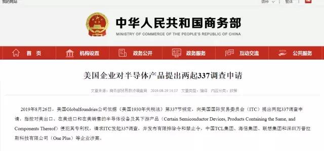 慧聪LED屏网报道 据商务部网站29日消息,8月26日,美国Globalfoundries公司依据《美国1930年关税法》第337节规定,向美国国际贸易委员会(ITC)提出两起337调查申请,指控对美出口、在美进口和在美销售的半导体设备及其