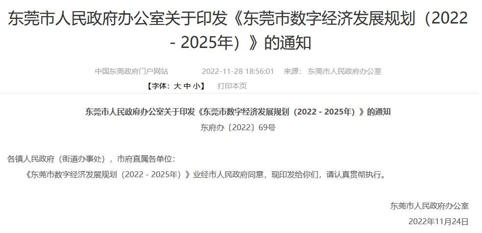 近日,东莞市人民政府办公室印发《东莞市数字经济发展规划(2022-2025年)》(以下简称《规划》)。