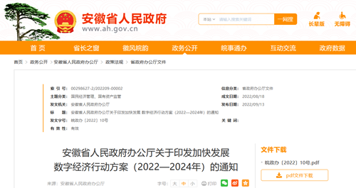 9月13日,安徽省人民政府办公厅印发《加快发展数字经济行动方案(2022—2024年)》(以下简称《行动方案》)。