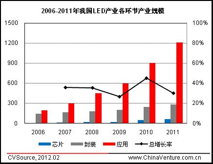 根据国家半导体照明工程研发及产业联盟(CSA)的数据显示,2011年我国LED行业总规模达到1560亿元,同比增长30%,增速略有放缓。China Venture投中集团分析认为,与其它新兴行业一样,LED行业目前正经历着阶段性产能过